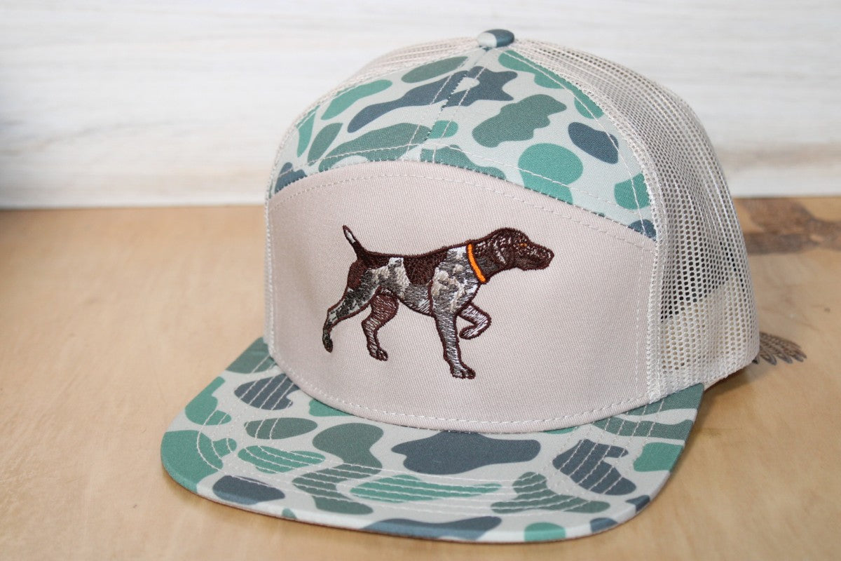 Made for long hunts, muddy boots, and loyal dogs at your side, the GSP Old School 7 Panel Camo Embroidered Hat is built for those who live the hunting lifestyle. Featuring a detailed embroidered German Shorthaired Pointer (GSP) design, this camo hat honors the grit, drive, and loyalty of one of the hardest-working hunting dogs in the field.